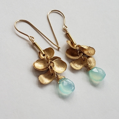 Gorgeous blue chalcedony earrings, hand forged gold petals.