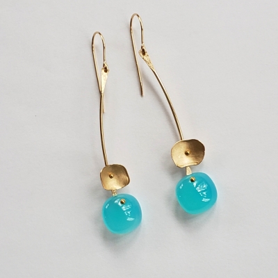 Incredible blue chalcedony candy like earrings with hand forged gold accents. Lightweight.