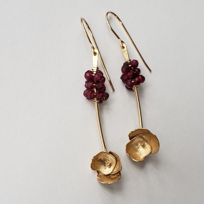 Shimmering garnet earrings, 14k gold filled flowers.